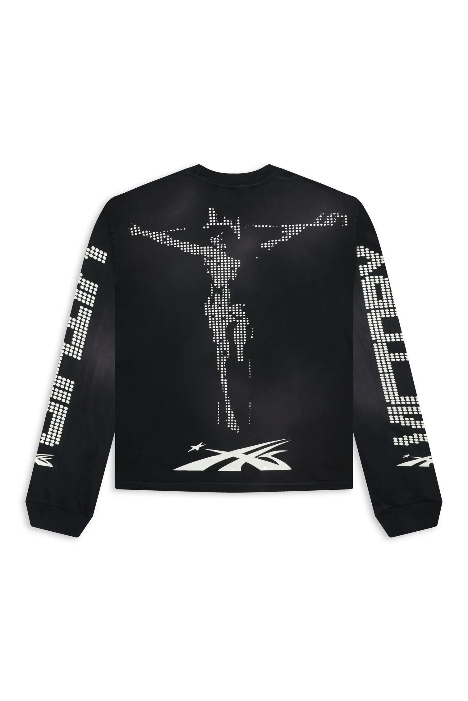 Custom cut and sew garment manufactured in Los Angeles. Dyed and potassium sprayed with jumbo screen print. This garment features a gel print graphic screen printed on the Chest, Back, and Arms. Fits true to size. Size up for an oversized fit. Gentle wash tumble dry.